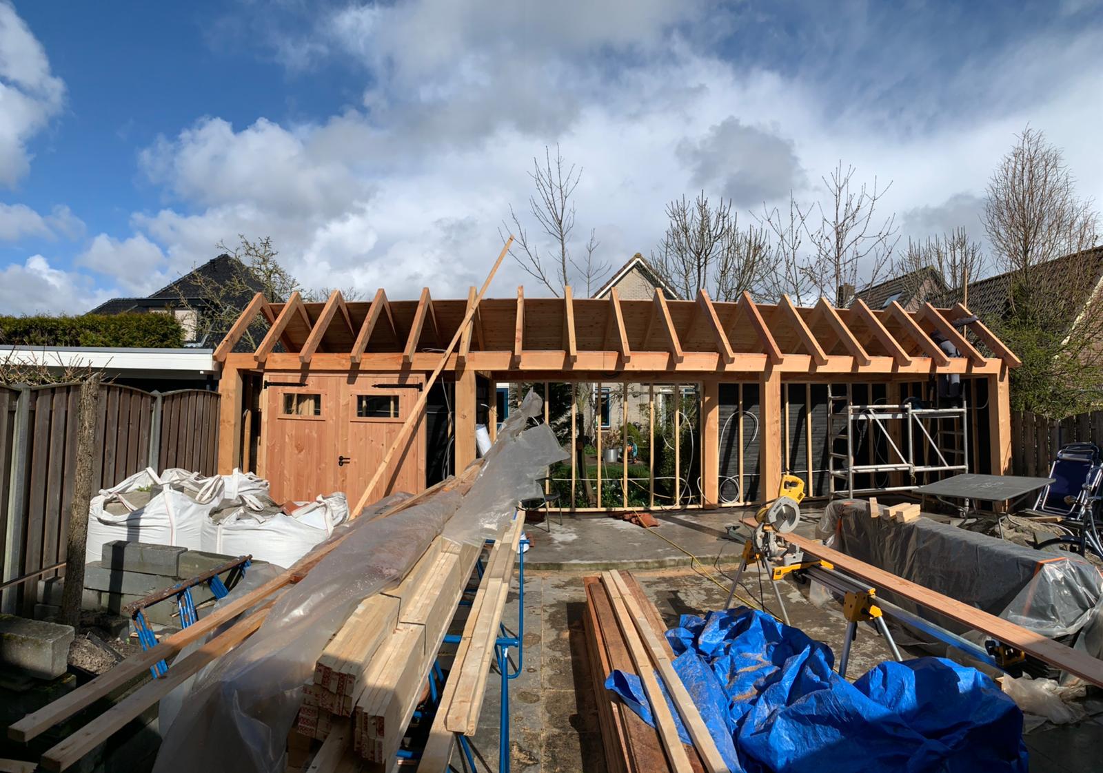 De bewoners wilden een plek in de tuin waar ze konden ontspannen, hout opslaan en het buitenleven wat langer konden oprekken, zonder dat het zijn charme verloor. We hebben een geheel nieuwe schuur met overkapping gebouwd, volledig afgestemd op de woning en omgeving.
